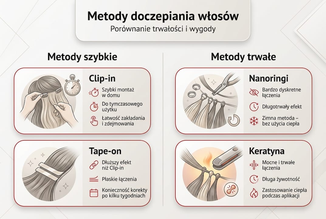 Clip-in zakładasz na kilka godzin i zdejmujesz codziennie. Tape-on utrzymuje się 6-8 tygodni przed refixacją. Nanoringi wymagają korekty po 3-4 miesiącach, a keratyna może pozostać na włosach nawet przez pół roku przy odpowiedniej pielęgnacji.
