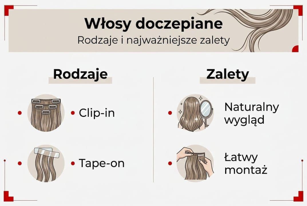 Włosy doczepiane cieszą się w Polsce rosnącą popularnością, a coraz więcej kobiet sięga po nie zarówno na co dzień, jak i przy wyjątkowych okazjach. Mimo to wciąż krążą mity o ich szkodliwości, trudnym zakładaniu czy sztucznym wyglądzie. Prawda jest zaskakująca: przy odpowiednim doborze i właściwej pielęgnacji doczepy są bezpieczne, wygodne i niemal niewidoczne dla otoczenia. W tym artykule wyjaśniamy, czym dokładnie są włosy doczepiane, jakie masz do wyboru rodzaje i metody mocowania, dla kogo są odpowiednie, jak o nie dbać i jak unikać najczęstszych błędów. Dzięki temu podejmiesz świadomą decyzję dopasowaną do swoich potrzeb.