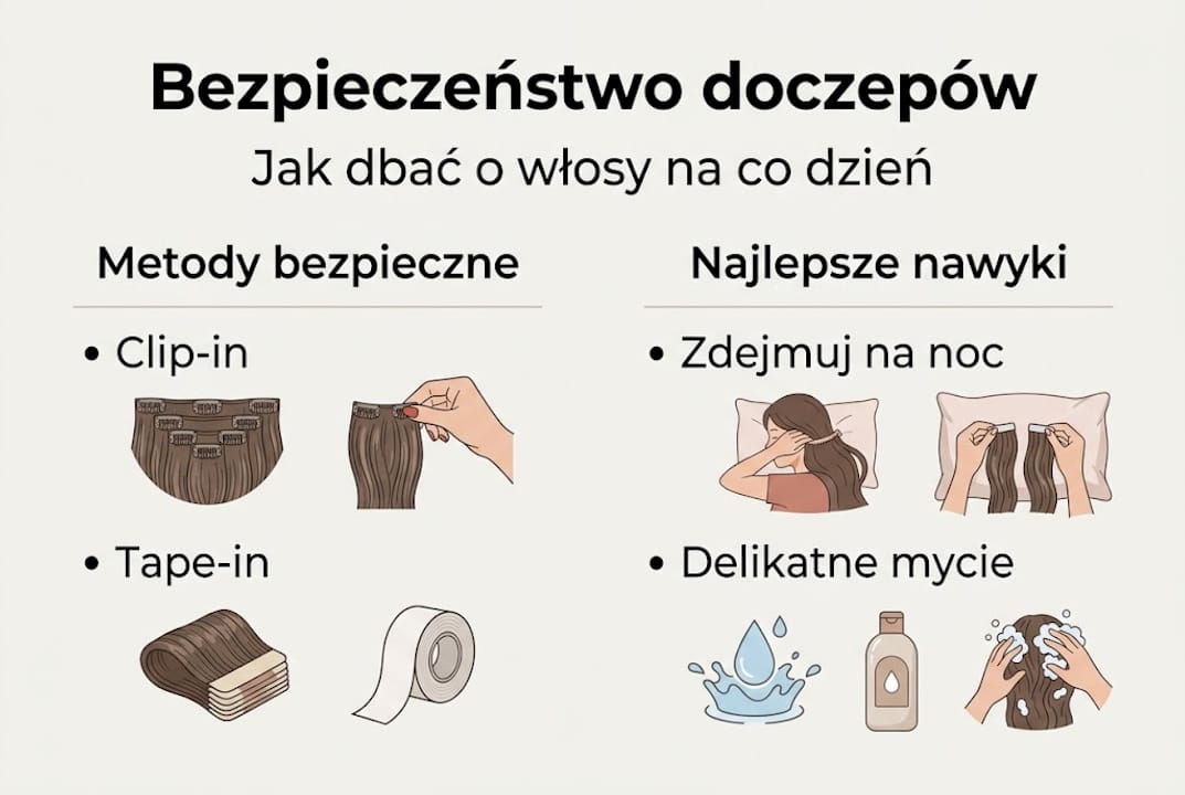 Właściwie dobrana metoda i odpowiednia pielęgnacja sprawiają, że doczepy nie muszą szkodzić naturalnym włosom. Clip-in są bezpieczne i elastyczne, natomiast metody trwałe wymagają ostrożności, szczególnie przy cienkich włosach.