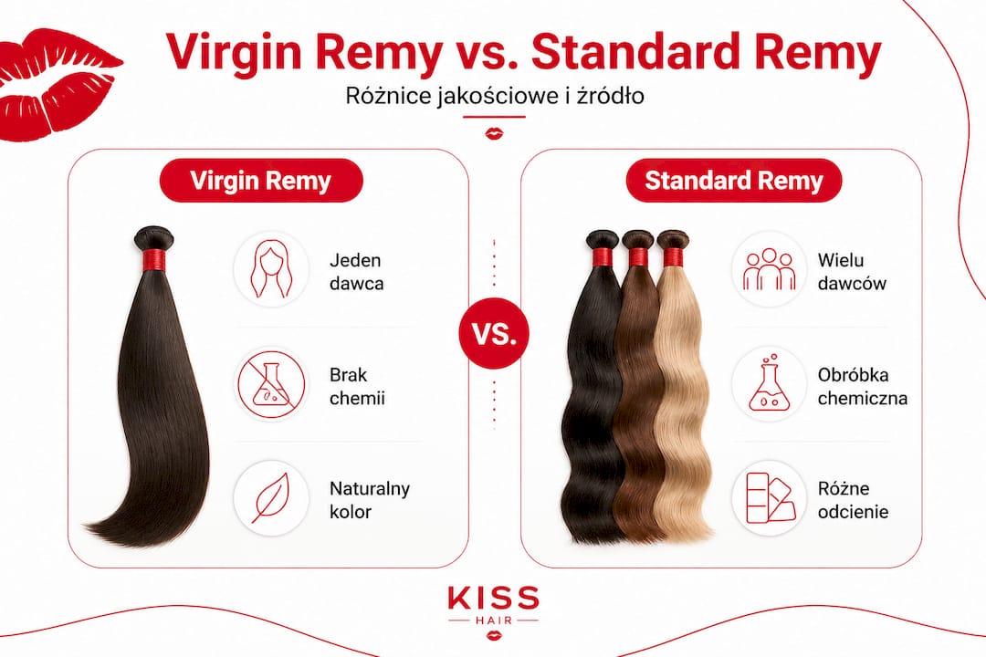 Wyjaśniliśmy, czym są włosy Remy – teraz czas przyjrzeć się ich dwóm głównym typom. Nie każde włosy Remy są takie same. Istnieje ważne rozróżnienie między włosami określanymi jako Virgin Remy a standardowymi włosami Remy, które ma realne konsekwencje dla jakości i możliwości stylizacji.